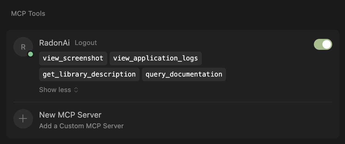 Radon IDE automatically configures and activates Radon AI MCP tools for you.